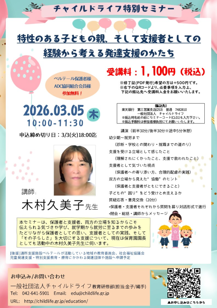 特性のある子どもの親、そして支援者としての経験から考える発達支援のかたち 2026 2/05 2026-02-05 お知らせ 運動学習理論に基づく摂食嚥下リハビリテーションの実際〜表面筋電バイオフィードバックを用いた訓練〜 吃音・流暢性障害のある子どもの基礎的理解と特性をふまえた心理・指導支援